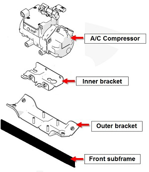 - Remove the 2 bolts that secure the A/C suction and discharge